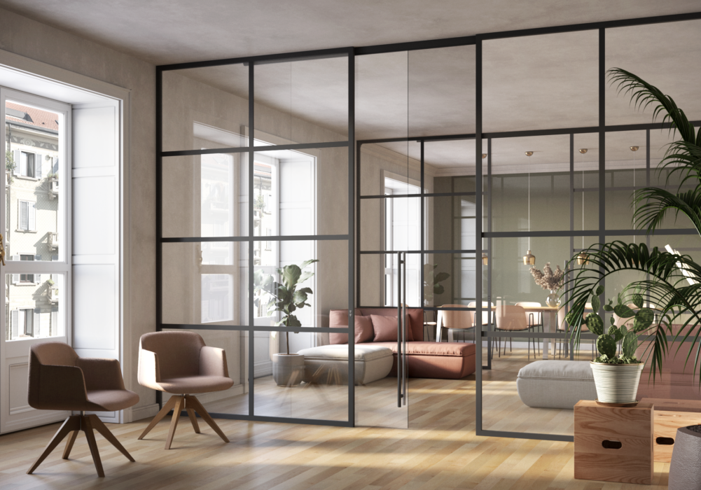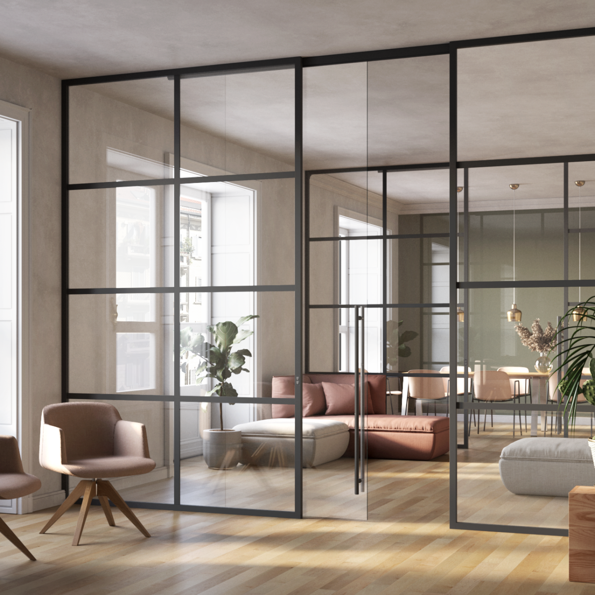 Icona is a high-performance wall system which, thanks to the telescopic elements on the floor and ceiling, allows to absorb the different tolerances of dimensions of the environments.
